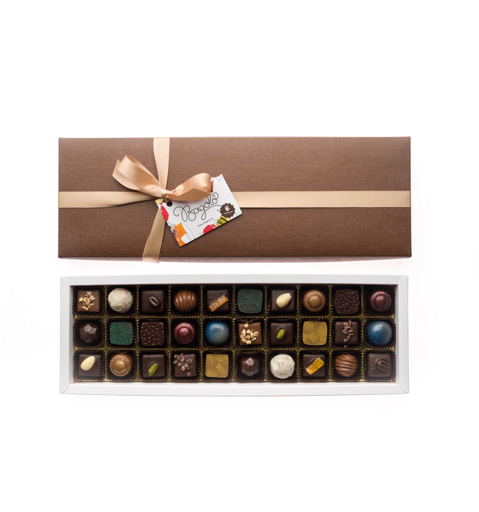 Elegantna smeđa kutija sadrži izbor trideset ukusnih pralina.