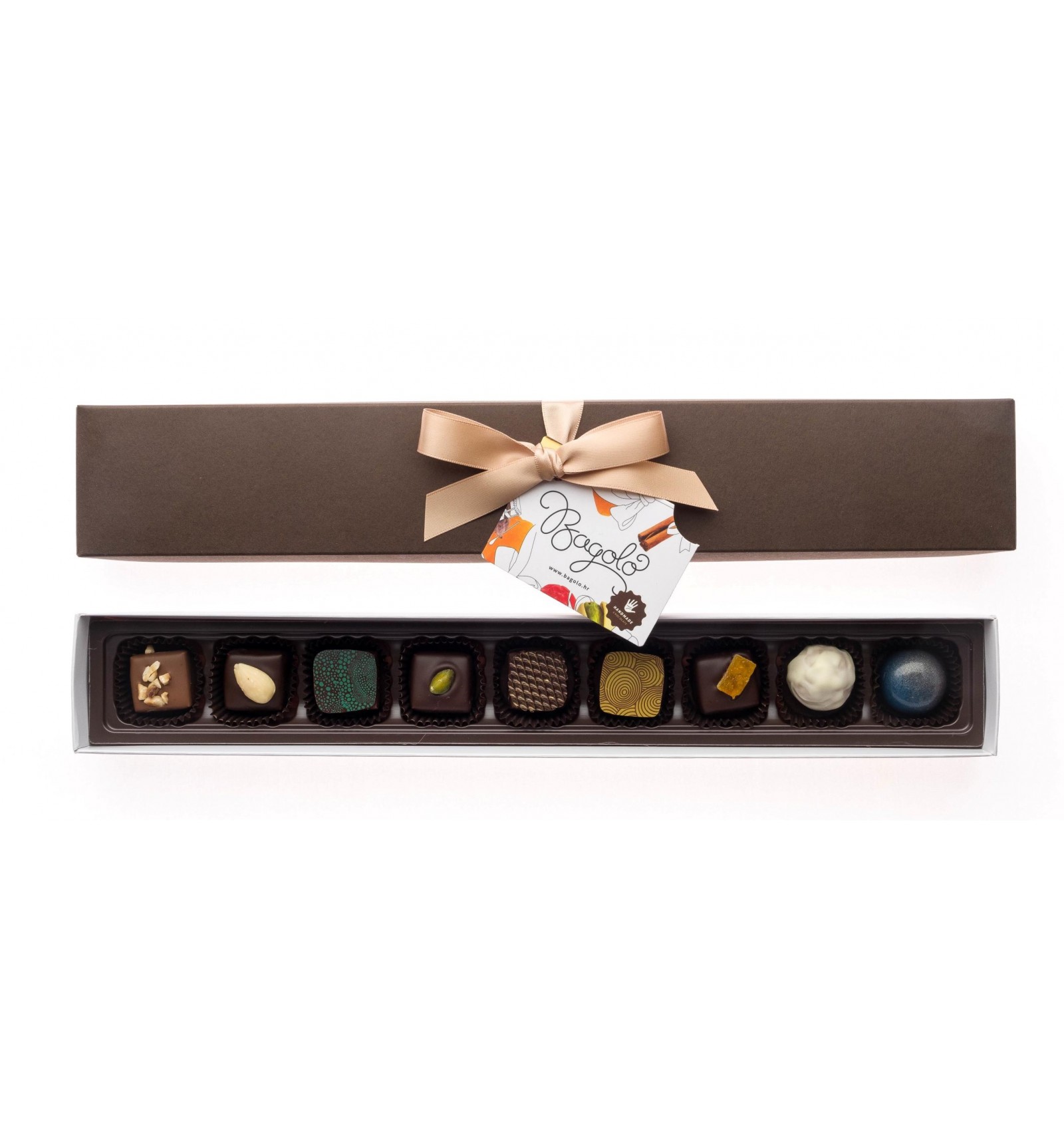 Elegantna smeđa kutija sadrži izbor devet različitih pralina.