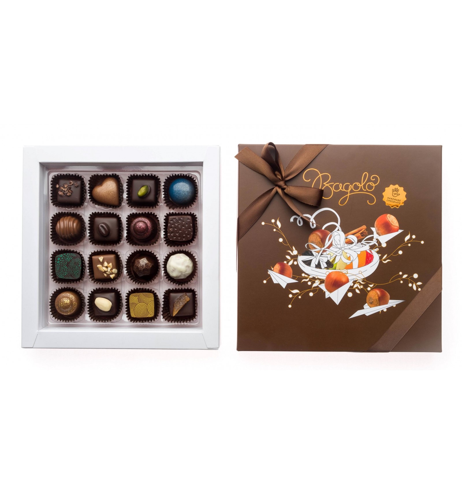 Elegantna smeđa kutija sadrži izbor šesnaest različitih pralina