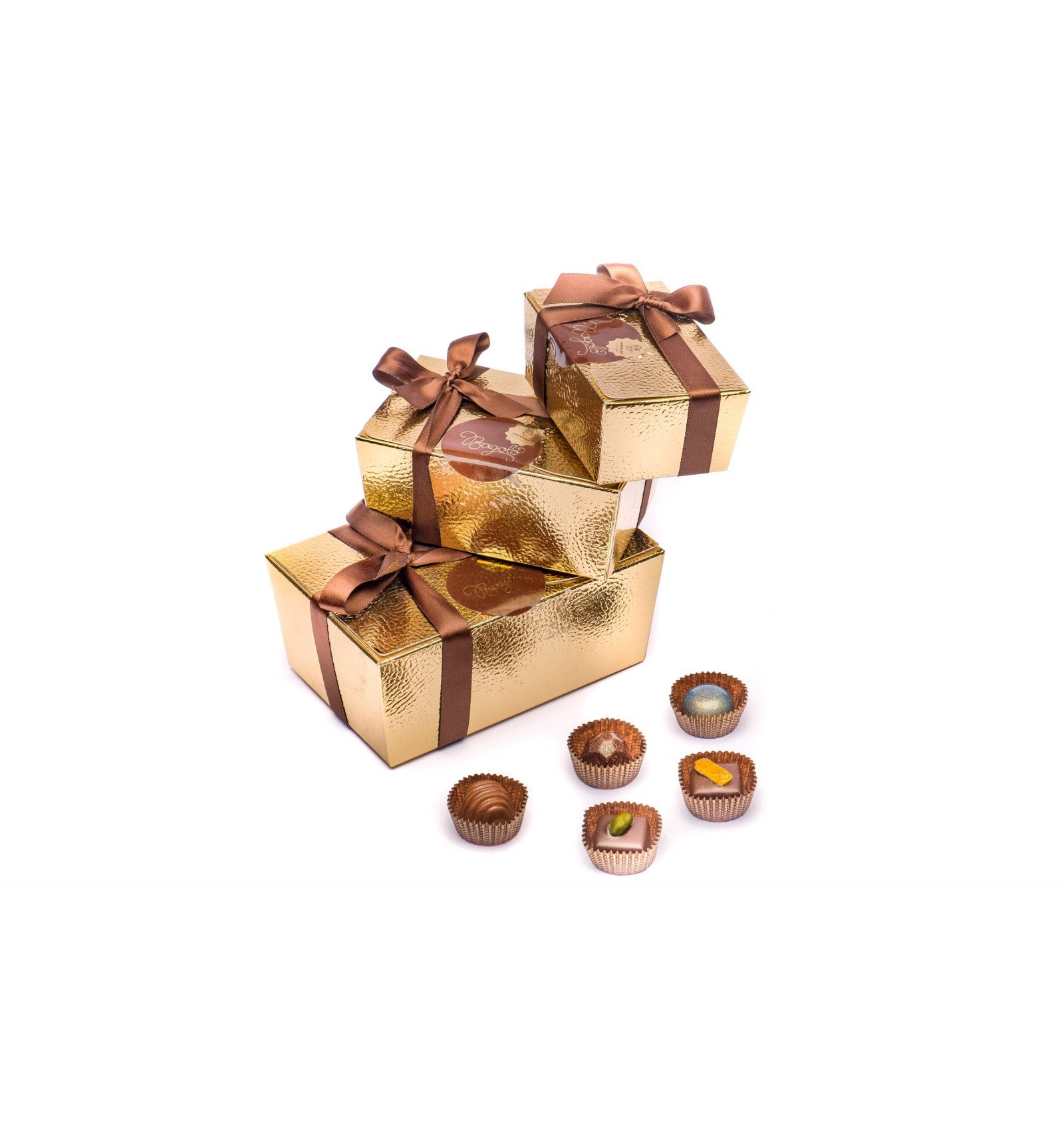 Ukupno 45 pralina složeno je bez plastičnih pregrada jedna do druge, na dva kata. Kutijica je dimenzija 155 x 100 x 70 mm, zlatne je boje, ukrašena je mašnicom.