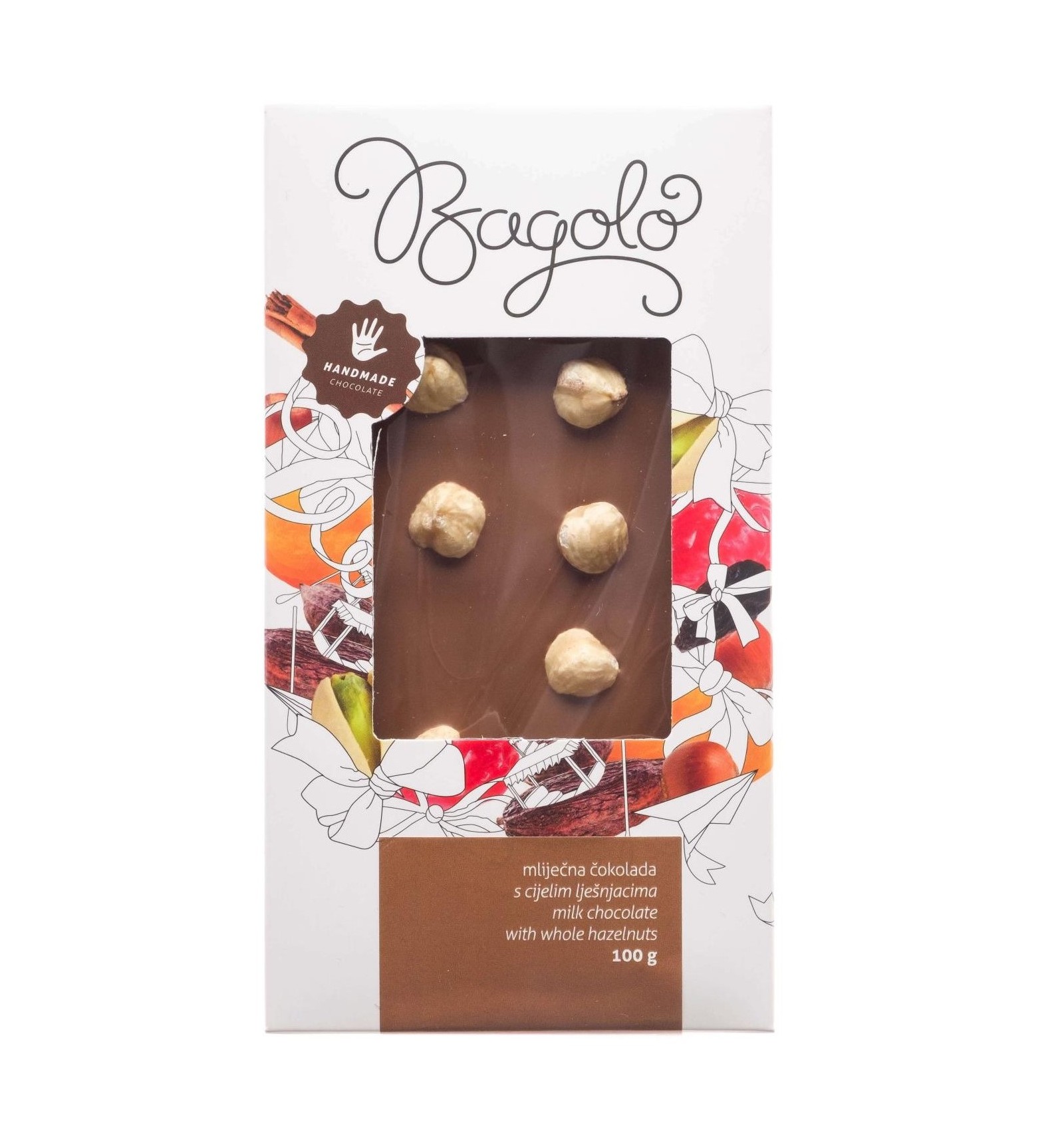 Sastojci: čokolada (šećer, kakaov maslac, punomasno MLIJEKO u prahu, kakaova masa, emulgator: SOJIN lecitin, prirodna aroma vanilije), LJEŠNJACI 10%. Proizvod može sadržavati tragove ostalog ORAŠASTOG VOĆA.