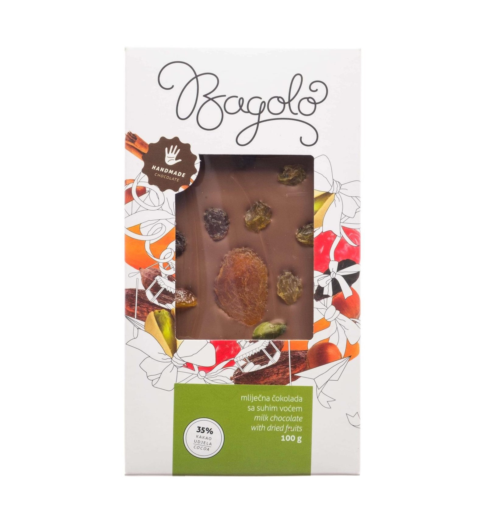 Sastojci: čokolada (šećer, kakaov maslac, punomasno MLIJEKO u prahu, kakaova masa, emulgator: SOJIN lecitin, prirodna aroma vanilije), suho voće 10% (marelica, grožđice, kandirana naranča (naranča, glukozni sirup, šećer), PISTACIJA. Proizvod može sadržavati tragove ostalog ORAŠASTOG VOĆA.