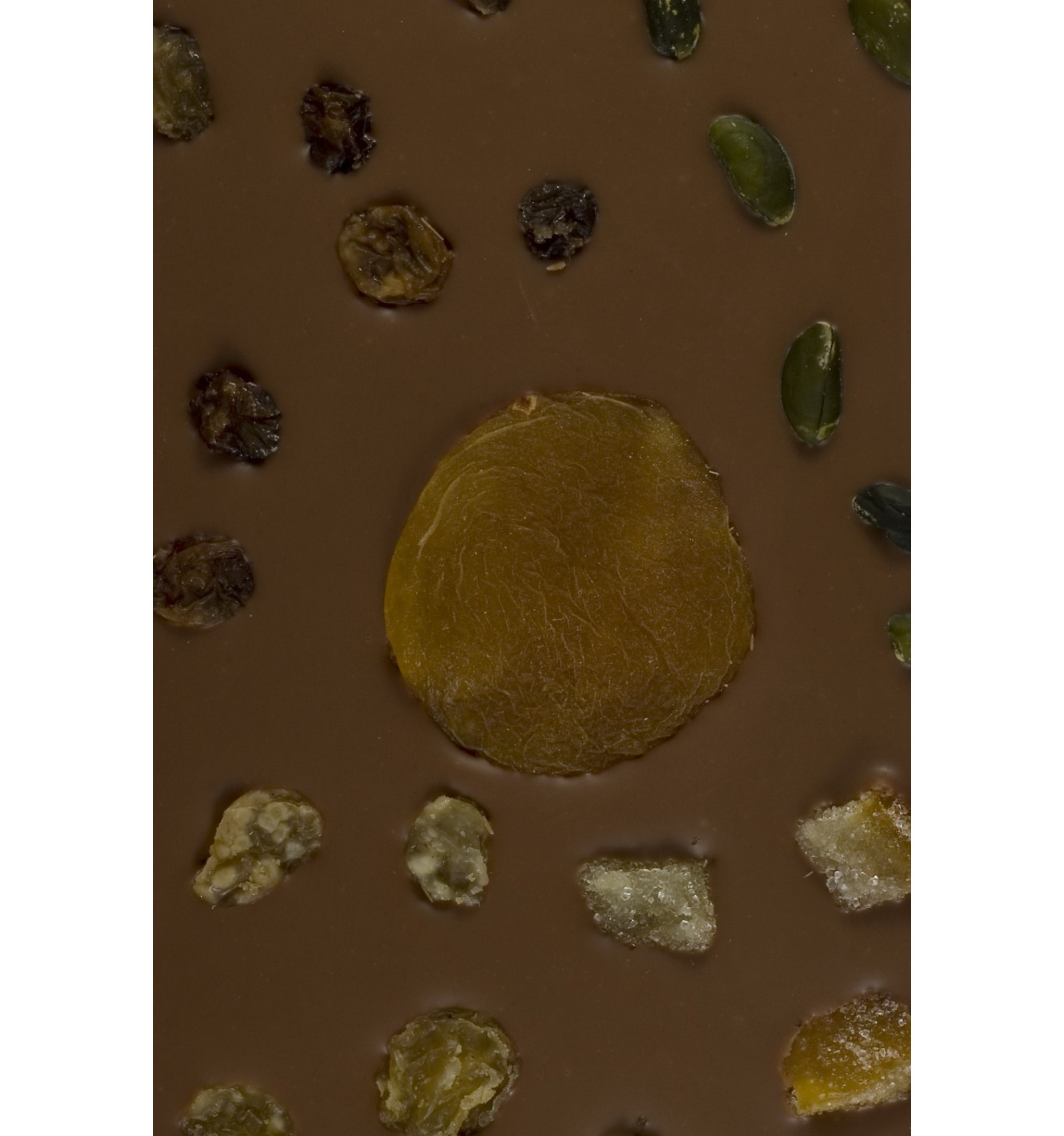 Sastojci: čokolada (šećer, kakaov maslac, punomasno MLIJEKO u prahu, kakao masa, emulgator: SOJIN lecitin, prirodna aroma vanilije), suho voće 10% (marelica, grožđice (konzervans sumporov dioksid), kandirana naranča (naranča, glukozni sirup, šećer), PISTACIJA). Čokolada sadrži: kakaovi dijelovi: 35% min. Može sadržavati tragove ostalih ORAŠASTIH PLODOVA.