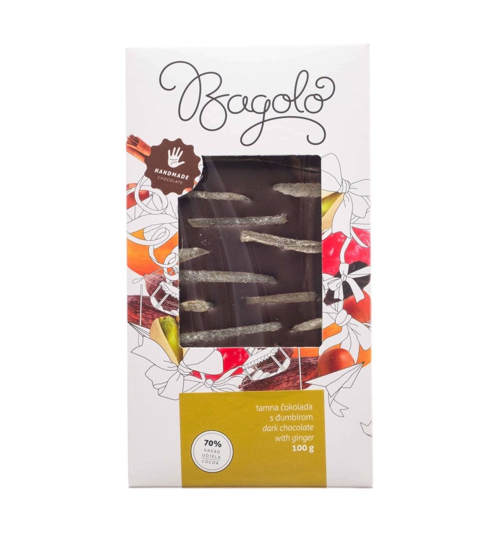 Sastojci: čokolada (kakaova masa, šećer, kakaov maslac, emulgator: SOJIN lecitin, prirodna aroma vanilije), kandirani đumbir 10% (đumbir, šećer, konzervans sumporov dioksid). čokolada sadrži: kakaovi dijelovi: 70% min. može sadržavati tragove MLIJEKA i ORAŠASTIH PLODOVA.