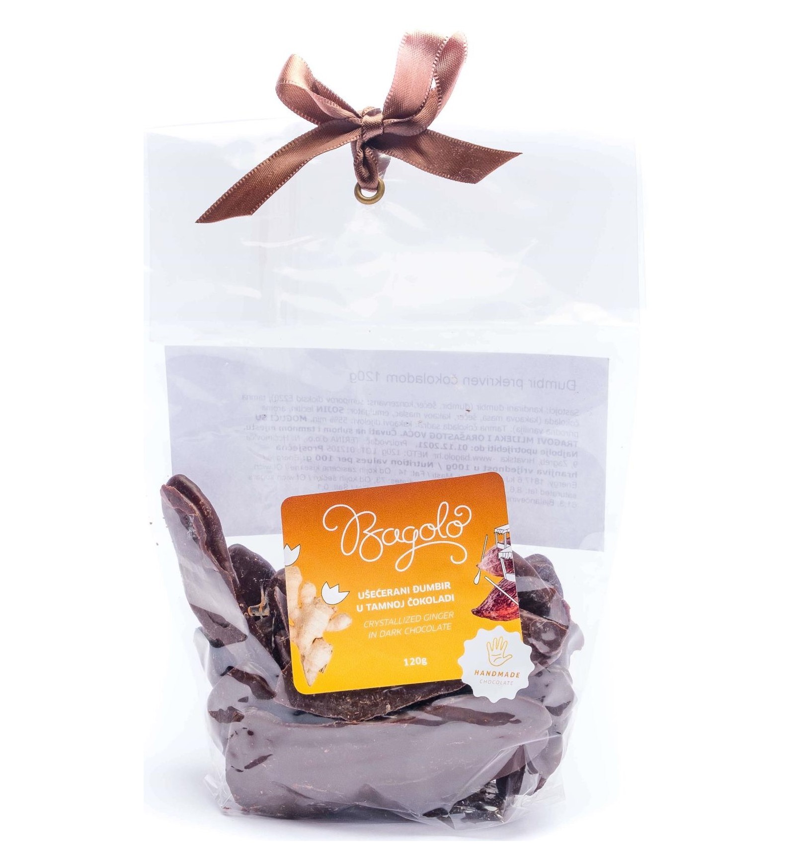 Sastojci: kandirani đumbir (đumbir, šećer, glukozni-fruktozni sirup), čokolada (kakaova masa,